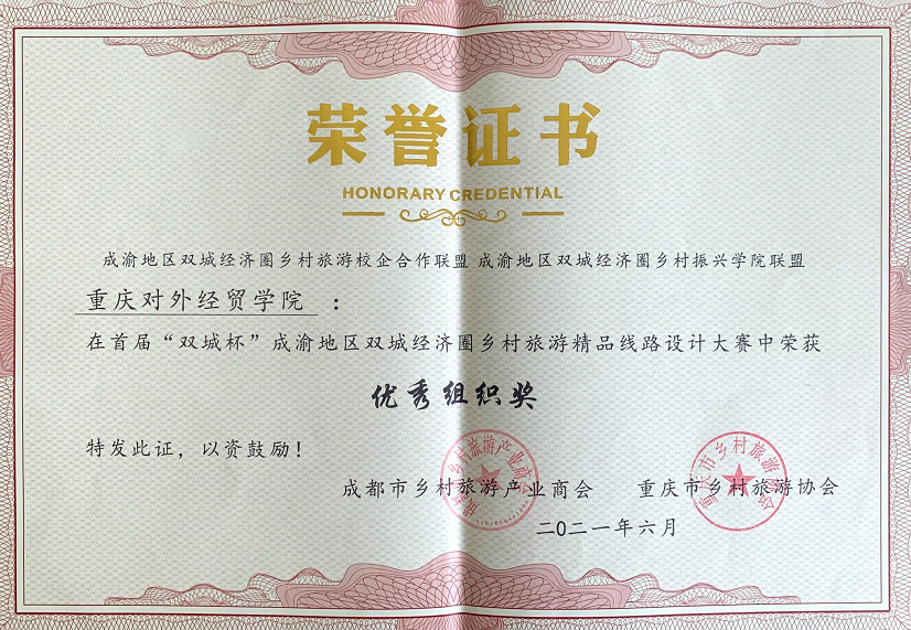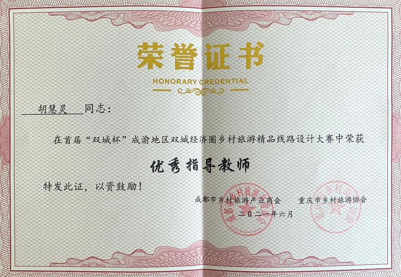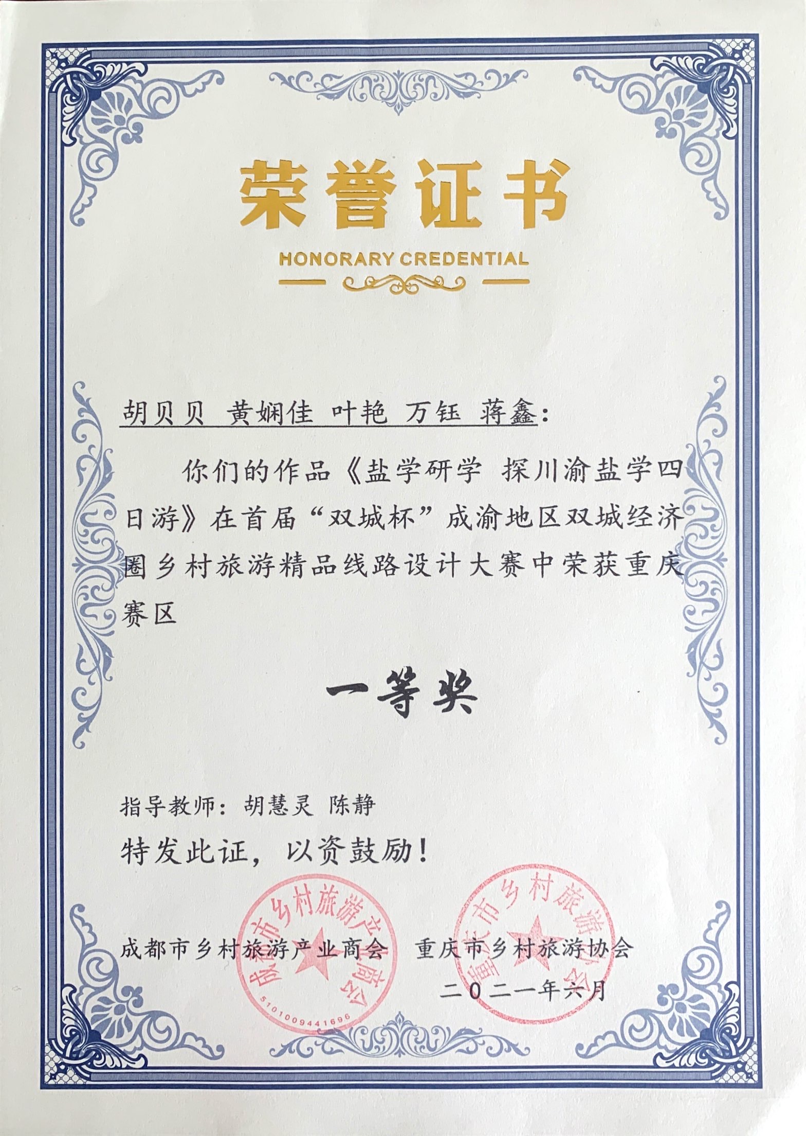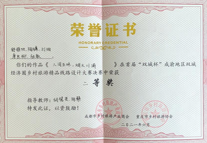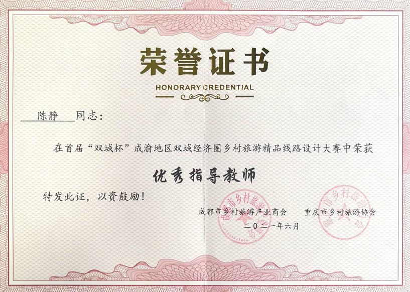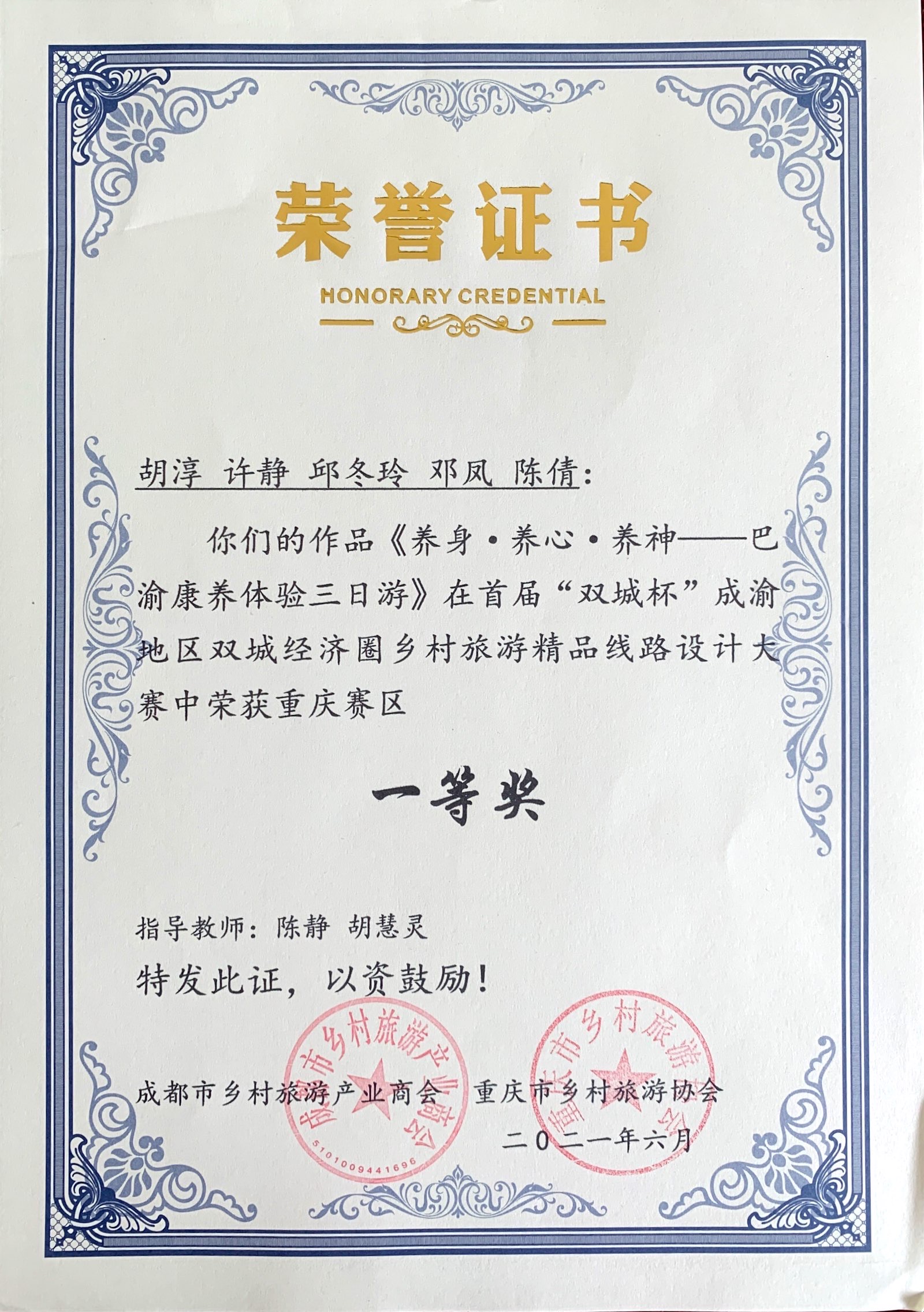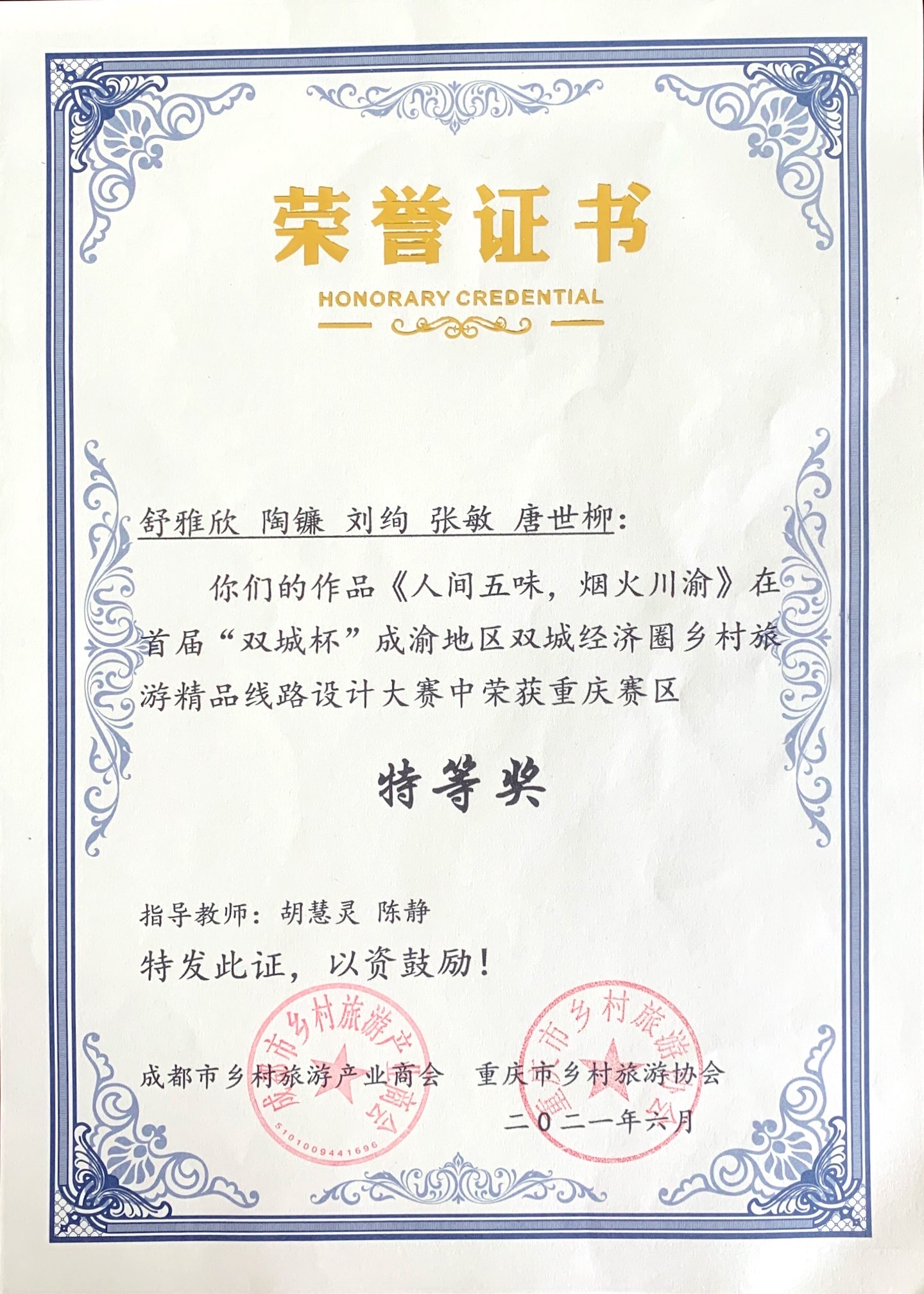 参赛团队在陈静、胡慧灵两名教师的组织下,经过前期的专项指导、模拟演练等训练后,最终2019级旅游管理专业员工作品《人间五味,烟火川渝》获得重庆赛区特等奖;《巴蜀滋味乡村休闲三日游》、《盐学研学 探川渝盐学四日游》、《养身·养心·养身—巴渝康养体验三日游》三个项目获得重庆赛区一等奖;《仰将帅风采忆往昔 游巴蜀之地展未来—将帅故里三日游》获得重庆赛区二等奖。在总决赛中,《人间五味,烟火川渝》获得二等奖以及学校获得优秀组织奖、两位指导教师均获优秀指导教师荣誉称号。