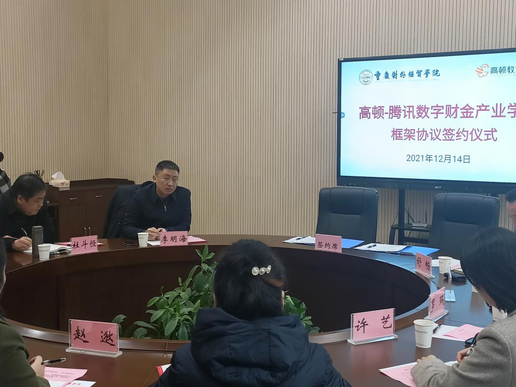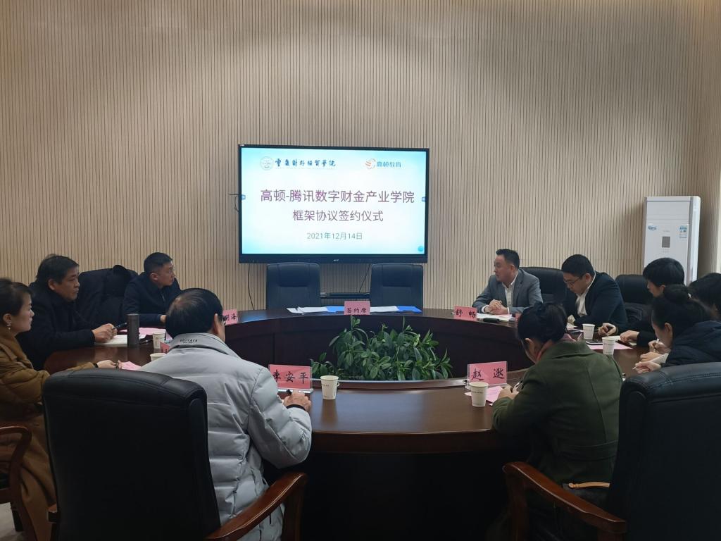为加快推进产教融合和创新发展,以实际行动回应数字经济时代的脉动,12月14日,公司与上海高顿教育科技公司共建“高顿-腾讯数字财金产业学院”框架协议签约仪式在9104会议室举行。