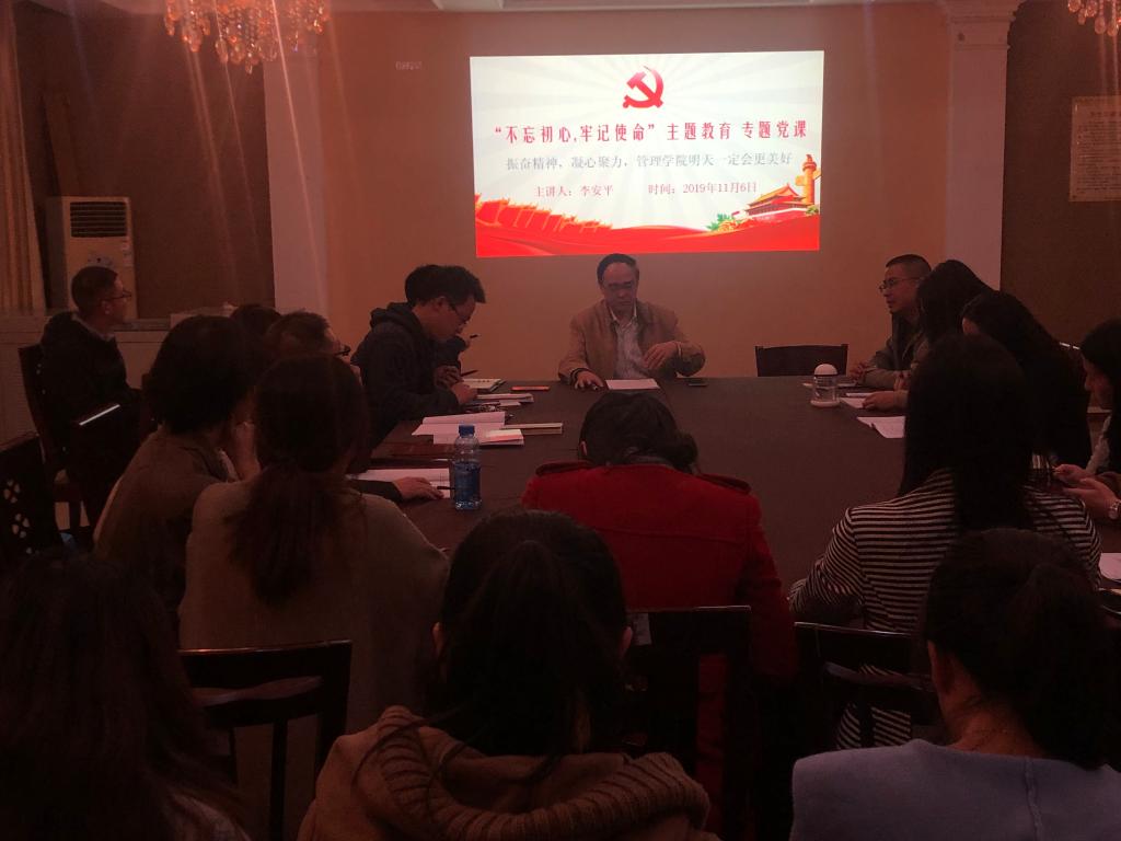 “为中国人民谋幸福、为中华民族谋复兴”是中国共产党人的出新和使命。我们党成立98年以来,新中国成立70年来,无论环境如何艰难、形势如何变化,始终坚守不变的是初心和使命。在专题党课上,李安平经理结合自身的经历讲了主题教育开展以来自身的学习及感悟,坚守初心使命对于中国共产党人的重大意义和共产党员的初心就是在党爱党忠诚一辈子。他强调,作为共产党员要坚持全心全意为人民服务搞好本职工作的赤子之心不动摇、坚持实现中华民族伟大复兴的雄心不动摇以及坚持实现中华民族伟大复兴的信心不动摇。同时指出,必一运动全体党员同志要凝心聚力,围绕学校的重点工作和学院的重点动作,推进“三大工程、六大计划”落实“九项行动”,树立新商科的概念,着重“课程思政”建设、实施“学业导师”,办人民满意的教育,培养社会主义建设者和接班人而努力奋斗。